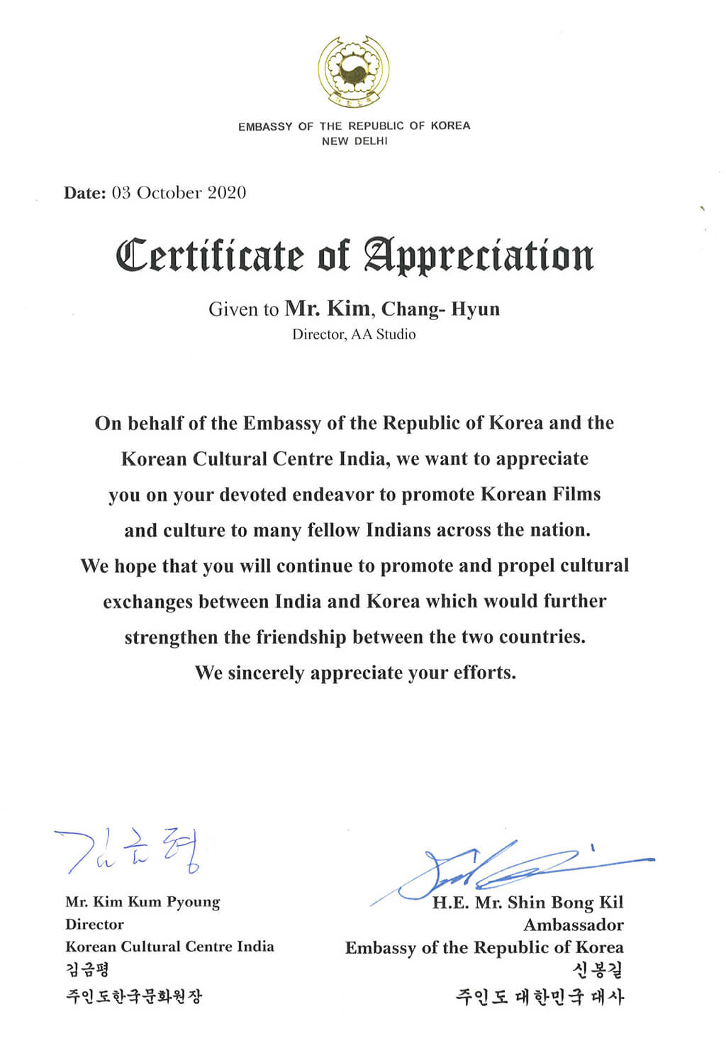 Awarded to MD Chang Hyun Kim, JNU, New Delhi